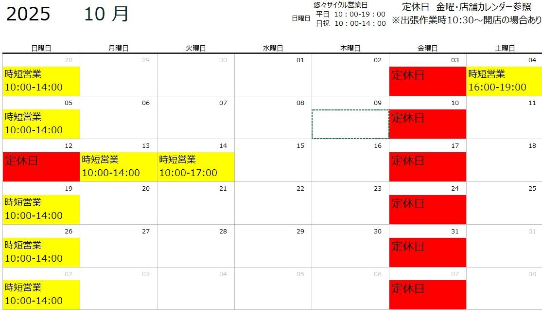 店舗名 | 悠々サイクル TEL 070-8314-9619 FAX 050-3488-9091 〒739-0025 広島県東広島市西条中央3丁目6-1渡部ビル 平常営業時間 月~土 AM10:00-PM7:00 日 祝 AM10:00-PM2:00 定休日 毎週金曜日 その他不定休 |